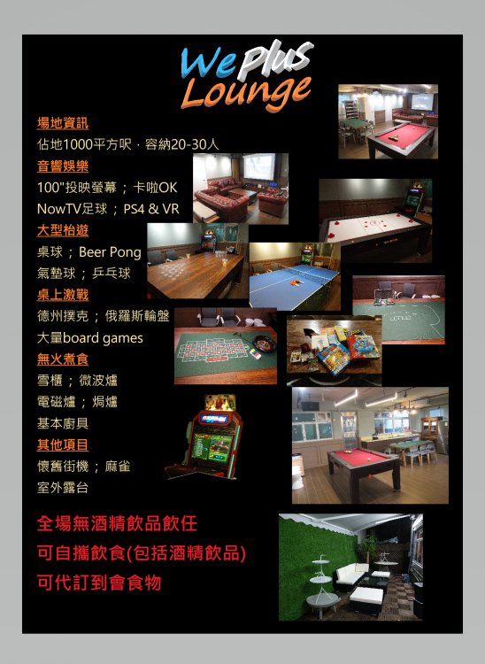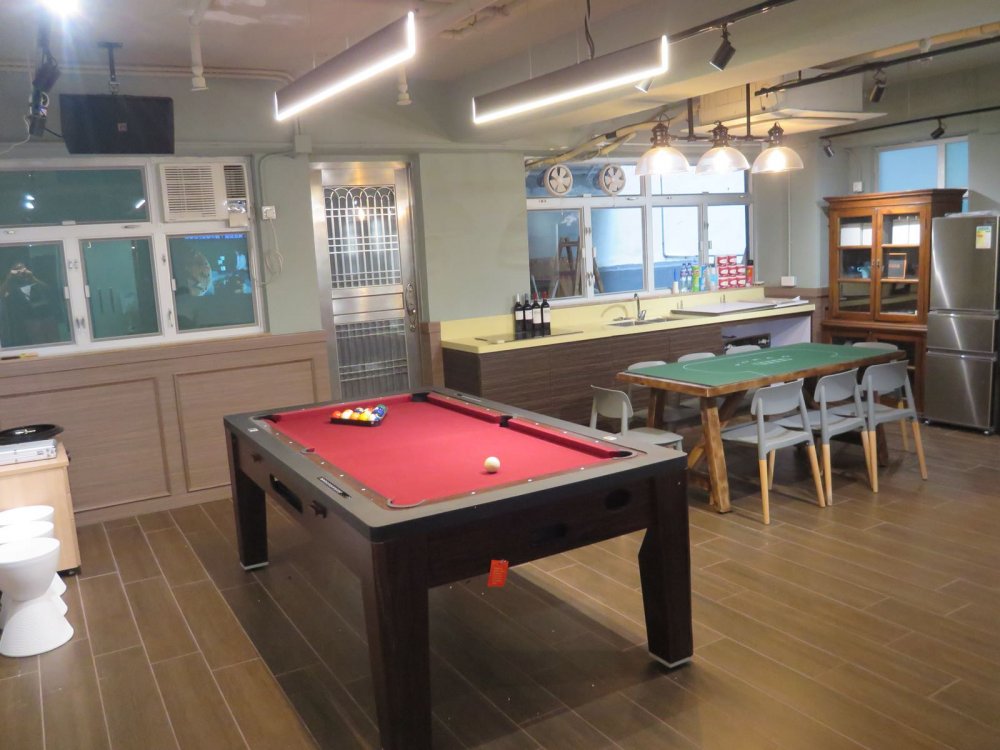 Silent environment with an open-kitchen and cooking facilities. Just spend 2 mins to walk from Ngau Tau Kok MTR Station. 24 hours operation and well equipped with sound system, 100" inch of big screen for live soccer, VR game, Karaoke, Board game, etc., Also you can chat with friends in the outdoor terrace to enjoy the great gathering moment.